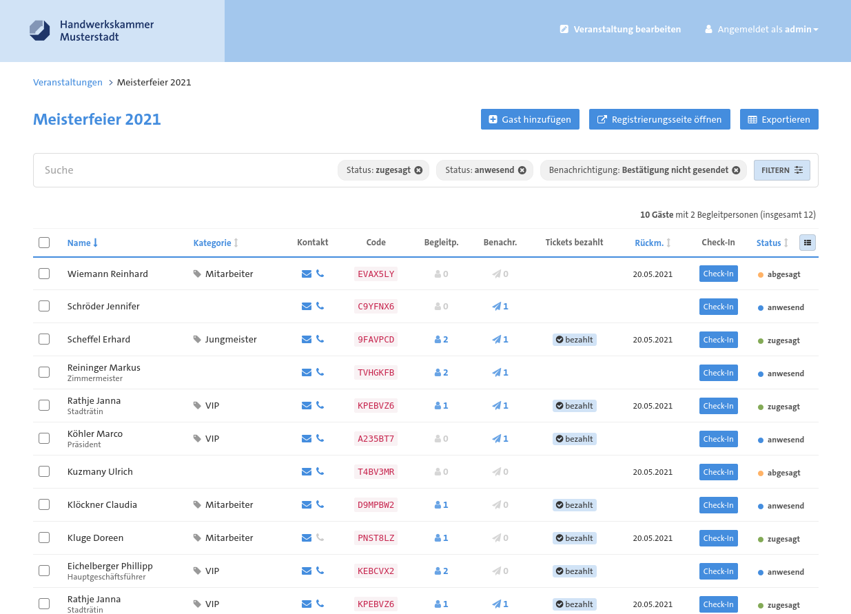 Die von mir entwickelte Web-Applikation stellt eine vielseitige Lösung zur Planung von Veranstaltungen bereit. Von Registrierung, Gästeverwaltung, Benachrichtigungsfunktion bis hin zu Ticketing und Check-In wird der gesamte Event-Workflow abgedeckt und automatisiert.